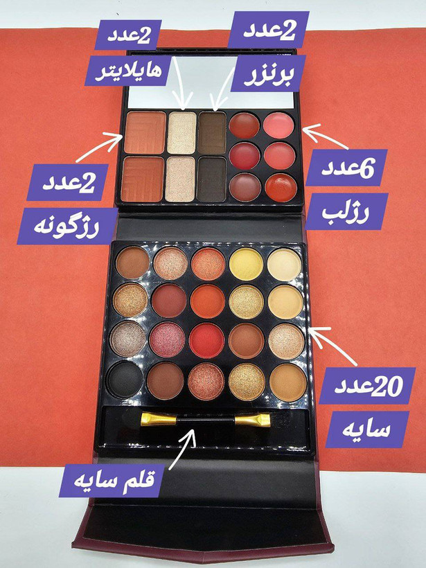- شامل ۲۰تا سایه. ۲تا روژگونه.۲تا سایه ابرو ۲ تا هایلایت ۶ تا رژلب