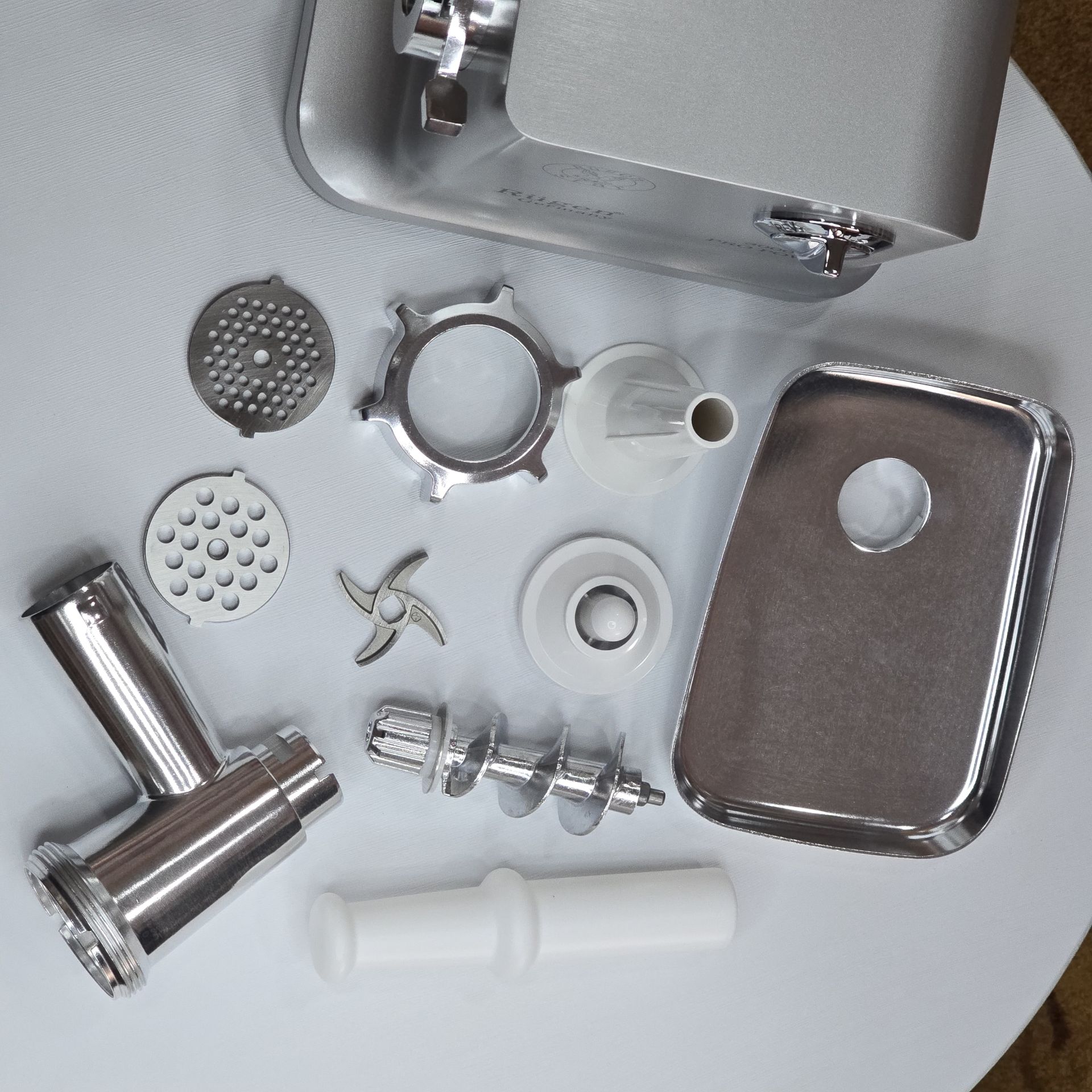 چرخ گوشت روگن مدل RU-1310 یکی از وسایل آشپزخانه است که برای چرخ کردن و خرد کردن انواع گوشت قرمز و برای درست کردن غذا های مختلف مانند کوفته، برگر، سوسیس خانگی، کالباس و همچنین با استفاده از چرخ گوشت روگن مدل RU-1310 می توانید انواع سبزی جات، حبوبات، گوشت مرغ، مغزی جات و سیب زمینی را خرد کنید. برای چرخ گوشت روگن مدل RU-1310 امکانات بی نظیری در نظر گرفته شده است. در همین راستا شرکت روگن این محصول خود را با فناوری ها و قابلیت های بی نظیری تولید می کند که تا حدود زیادی این چرخ گوشت را به یک دستگاه صنعتی اما در قالبی کوچک تر تبدیل کرده است، که برای مثال می توان به طراحی بسیار زیبای آن در کنار گیربکس فلزی به همراه تیغه های فولادی و گلویی بزرگ اشاره کنیم. این چرخ گوشت حرفه ای از بدنه ای تیتانیومی به رنگ نقره ای بهره می برد که بر روی آن یک پنل آنالوگ و عقربه ای تعبیه شده است و به کمک آن می توانید دستگاه را روشن و خاموش کنید و یا سرعت آن را کم و زیاد کنید . بدنه ی چرخ گوشت روگن مدل RU-1310 از جنس تیتانیوم ریخته گری می باشد که قوی تر و سبک تر از استیل است.